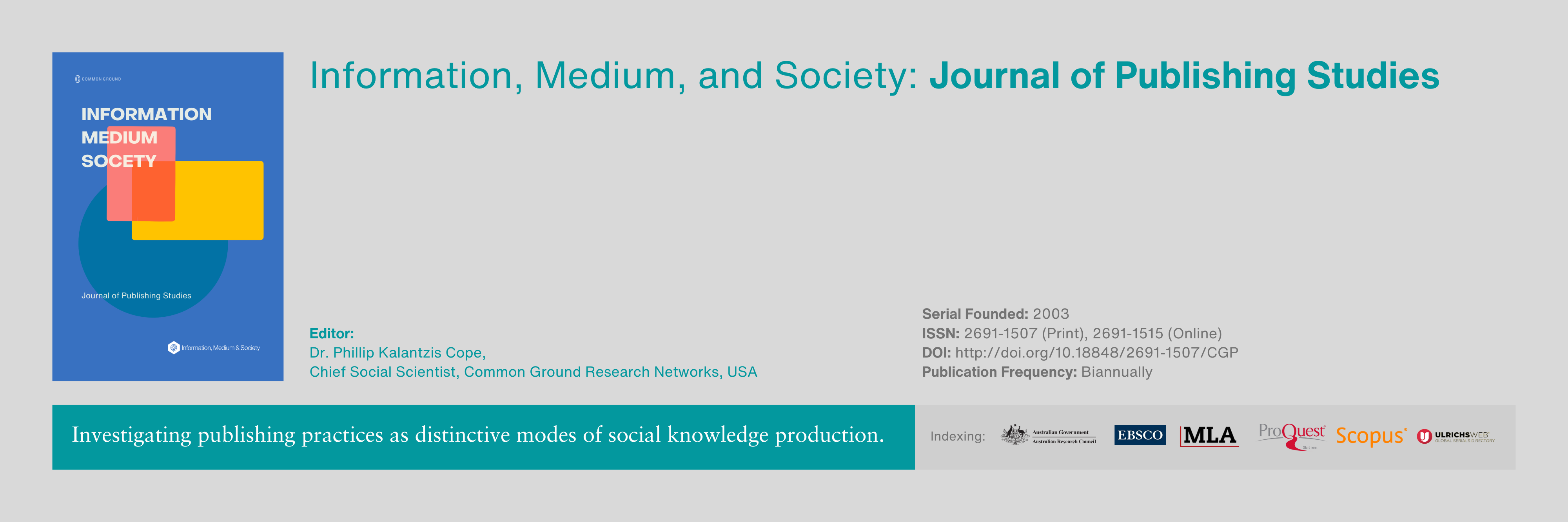 Information, Medium & Society: Journal of Publishing Studies is brought together by a shared interest in investigating publishing practices as distinctive modes of social knowledge production. We seek to build an epistemic community to make linkages across disciplinary, geographic, and cultural boundaries. The journal collection is defined by our Research Network scope and concerns and motivated to build strategies for action framed by our shared themes and tensions.