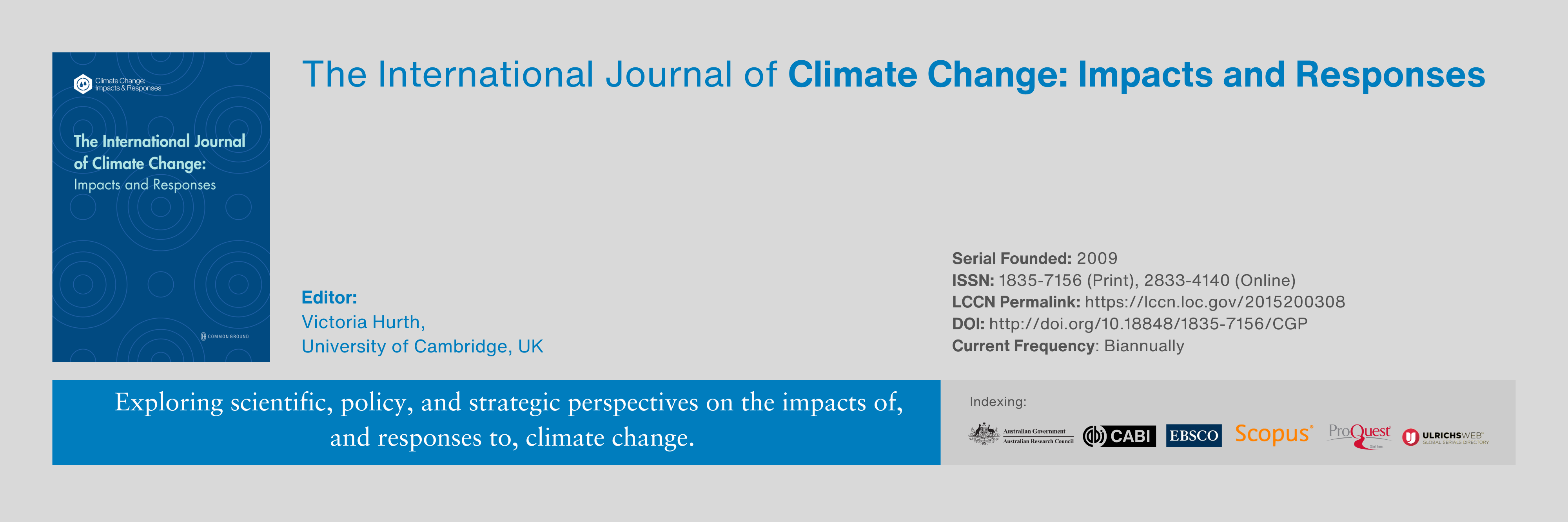 The International Journal of Climate Change: Impacts and Responses is brought together by a common concern for the science of, and social responses to, climate change. We seek to build an epistemic community to make linkages across disciplinary, geographic, and cultural boundaries. The journal is defined by our Research Network scope and concerns and motivated to build strategies for action framed by our shared themes and tensions.