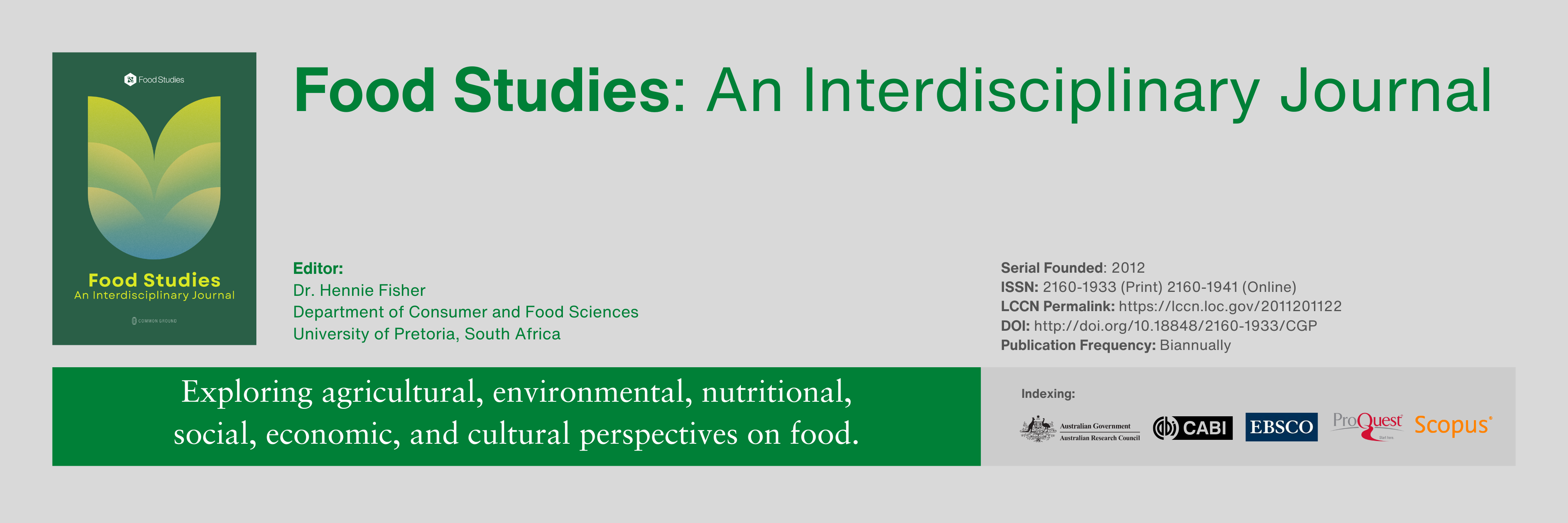 We are committed to expanding the visibility, reach, and impact of research from the Food Studies Research Network. Journals in Food Studies: An Interdisciplinary Journal can be found in numerous databases, accessible via the libraries of institutional subscribers, and in the CGScholar Bookstore for current Research Network Members.