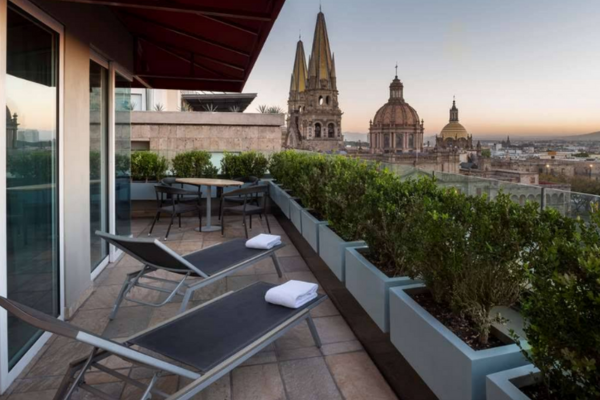 From the hotel: "Find us in the historic city center, within three blocks of attractions, including Guadalajara Cathedral, the Degollado Theater, and museums. We offer a top-floor restaurant and bar overlooking the city, and several of our rooms and suites feature an outdoor terrace. Enjoy our fitness center and a warm DoubleTree Cookie when you arrive."
