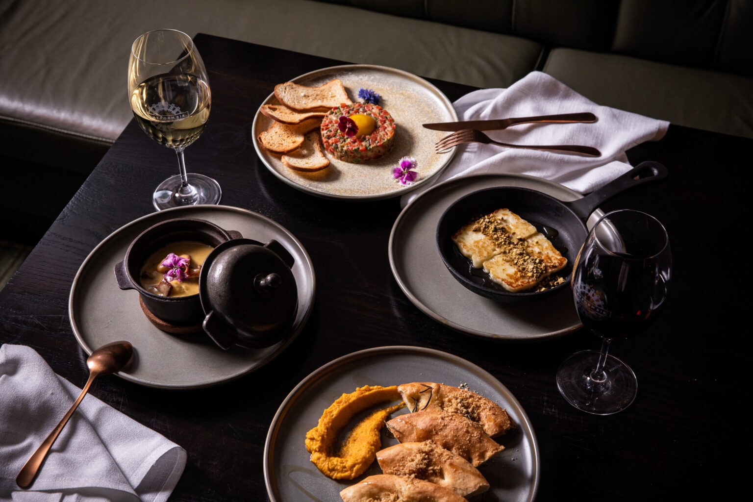 Dinner will begin with starters to share. For the main course, the guests can choose a Slow Cooked Lamb Shoulder (meat option), a Crumbed Market Catch (fish option), or a vegetarian option. The meal will conclude with a chef’s selection dessert. The menu includes a choice of Premium Crystella Still and Sparkling Water. Alcoholic drinks are not included.