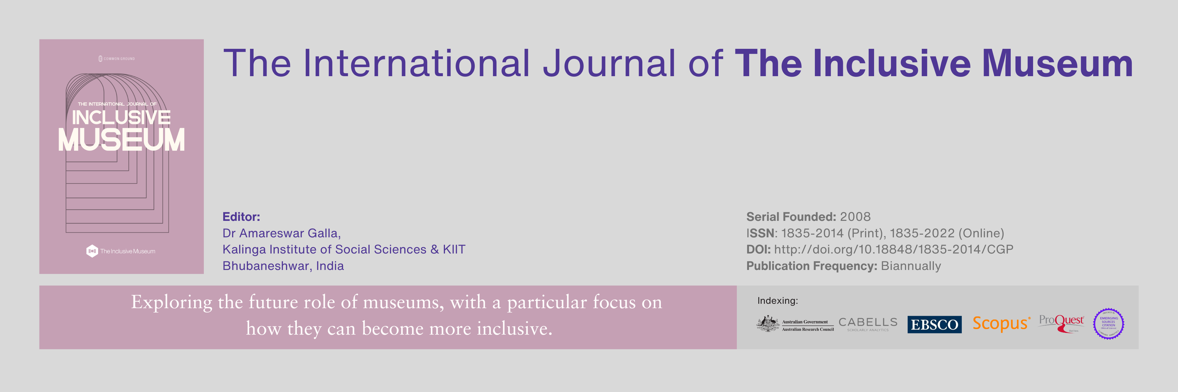 We are committed to expanding the visibility, reach, and impact of research from The Inclusive Museum Research Network. The International Journal of the Inclusive Museum can be found in numerous databases, accessible via the libraries of institutional subscribers, and in the CGScholar Bookstore for current Research Network Members.